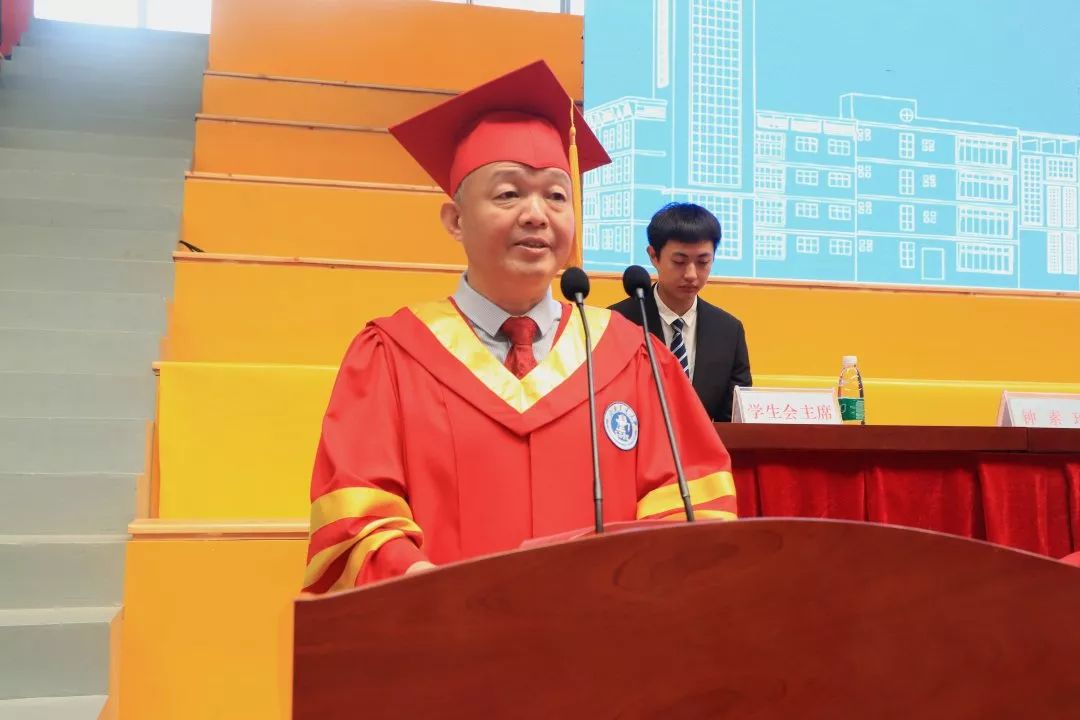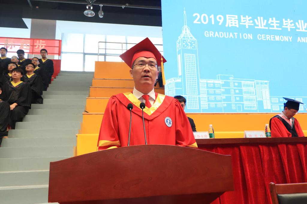 机械与动力工程学院老师代伟业代表我校教师发言,他谈到,希望毕业生们不忘初心,牢记人生最本质的输赢取决于正直、坚毅的品格。