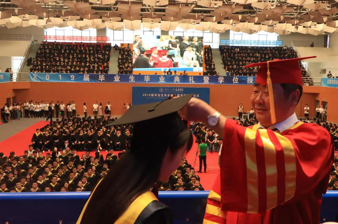 院长王化深教授为毕业生代表拨苏正冠,正式启动学校学位授予仪式。今年的学位授予仪式在我校体育馆、天佑会堂同时进行。