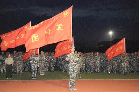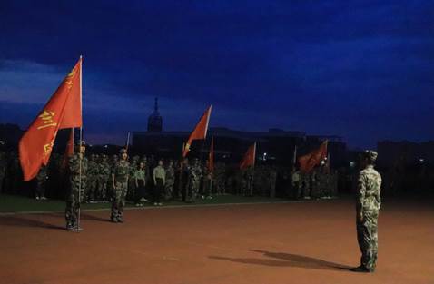 凌晨四点,军训团学员们已经整理好床铺,打好背包,在军训团教官、指导员的带领下,高举各营连旗帜,精神抖擞地在操场集结待命。