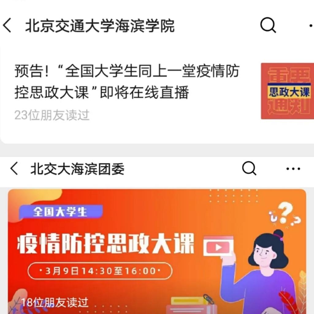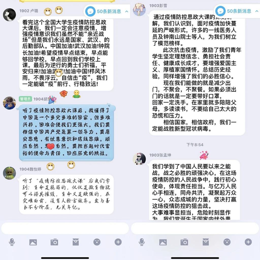 我校党委高度重视“全国大学生同上一堂疫情防控思政大课”的组织工作,宣传统战部、校团委、基础教学部思政教研室等单位和各学院(系)第一时间发布收看通知,思政教研室更是将“全国大学生同上一堂疫情防控思政大课”纳入到疫情防控期间思政课的教学统一安排之中,合理设计教学环节,组织学生进行线上集体讨论,引导学生畅谈感想,将思想政治理论课教学优势转化为防疫斗争的强大力量。