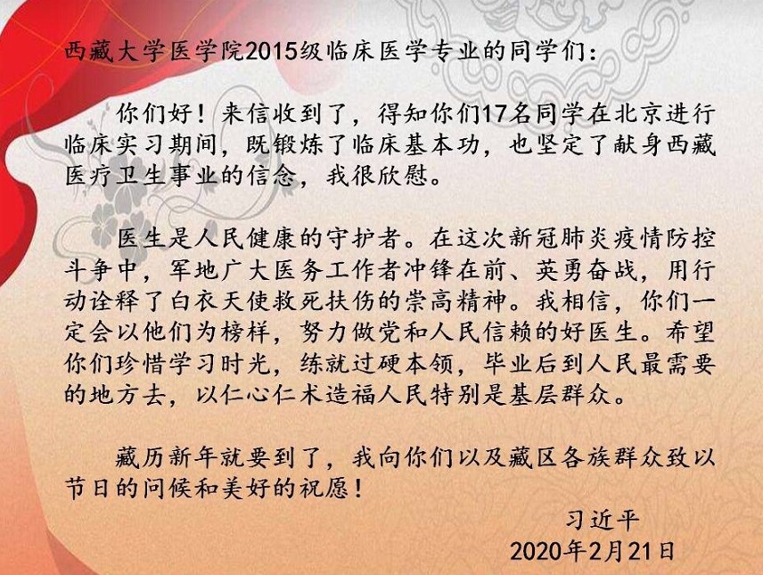 2020年2月21日,习近平总书记给正在北京大学首钢医院实习的西藏大学医学院学生回信,肯定了他们献身西藏医疗卫生事业的信念,勉励他们珍惜学习时光,练就过硬本领,造福基层群众,并向他们以及藏区各族群众致以节日的问候和美好的祝愿。我校党委高度重视、精心安排,在全校范围内掀起了学习习总书记回信精神的热潮,师生引发强烈反响。