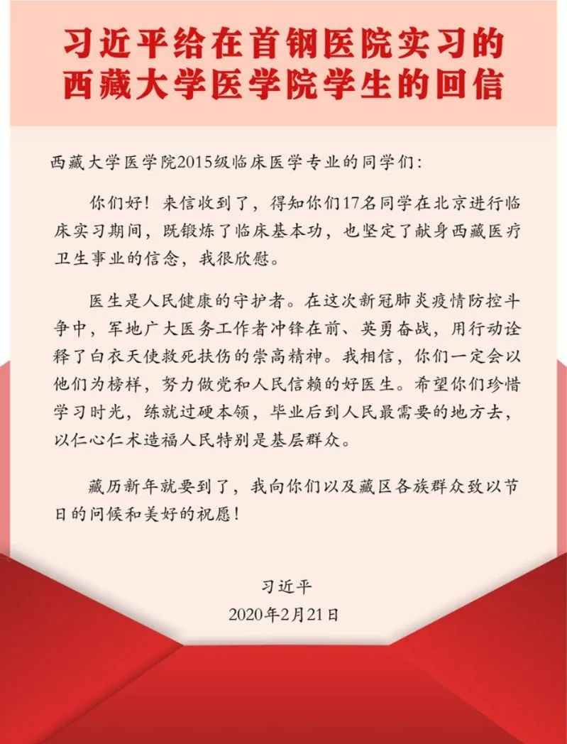 副院长时国松谈到,习近平总书记的回信内容饱含热情、语重心长,充分展示中央对西藏卫生事业的重视,尤其是在举国抗疫的全国环境下,意义非凡。作为教育事业的普通工作者,要深刻领悟重要回信精神,把工作落到实处,把学生培养成本领过硬、造福人民群众、合格的社会主义事业接班人,引导毕业生到人民需要的地方去,为社会主义事业作出更大的贡献。