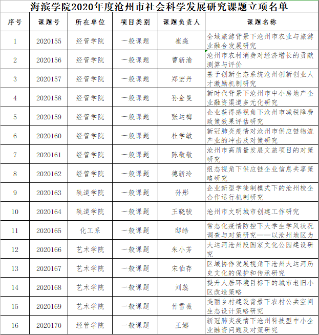 4月9日,沧州市社会科学界联合会组织开展2020年度沧州市社会科学发展研究课题申报工作。我校科技处根据《2020年度沧州市社会科学发展研究课题指南》要求,积极组织各单位申报,于4月21日报送课题共计29项。5月15日,经沧州市社会科学界联合会评审,确定我校2020年度沧州市社会科学发展研究课题获准立项16项。