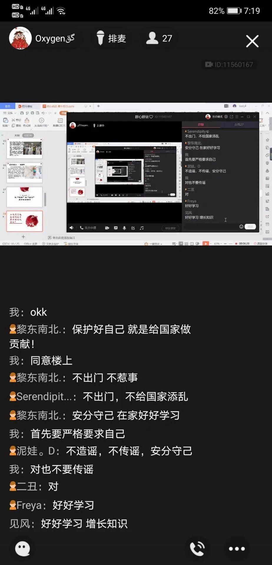 同时英语1704班同学针对如何防治疫情发表了自己的看法。心理委员潘云飞表示“面对疫情,我们要响应政府号召,少出门或不出门利用网络宣传国家政策不信谣不传谣静下心来,合理安排学习和生活”宣传委员黄婷婷讲到“我们要听从党和政府的领导指挥,注意隔离,不去人员密集场所,保证自己的健康就是对国家的贡献。”