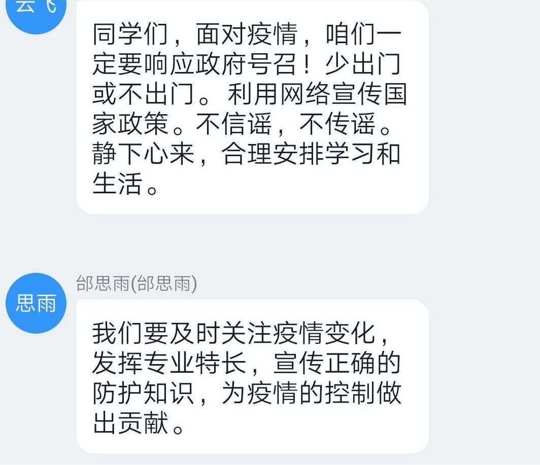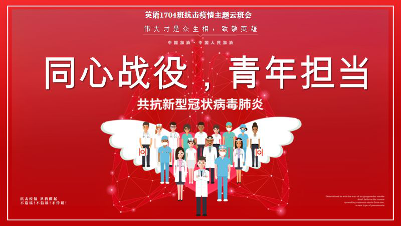 在全国上下一心抗击新冠肺炎疫情的关键时刻,作为新时代大学生,认真落实上级决策部署全力支持疫情防控工作,是我们义不容辞的责任。我校外国语学院积极响应号召,倡议各班隔空互动,召开以“同心战疫,青年担当”为主题的班会。