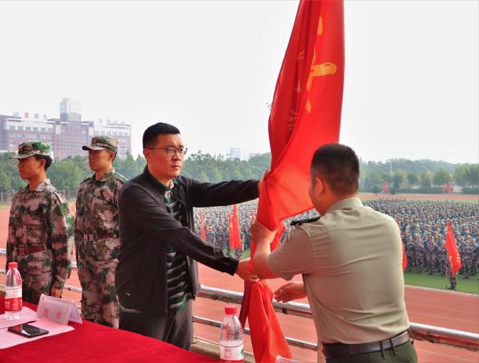党委副书记魏炜为2019级军训团授旗,2019级军训团团长、学生处副处长、武装部副部长翟砚辉接旗。