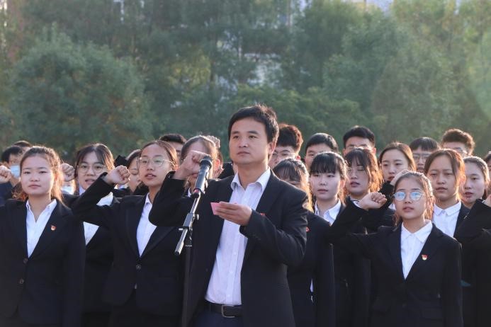 9月30日上午7时,我校隆重举行以“国旗在我身边”为主题的升旗仪式,为中华人民共和国成立71周年献礼,共同祝愿伟大的祖国更加繁荣富强。我校党委副书记魏炜、各院系副院长(副主任)、学工办主任受邀出席本次升旗仪式,全体2020级新生辅导员老师及部分学生代表参会。学生处教师王达主持此次升旗仪式。