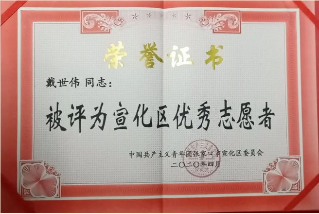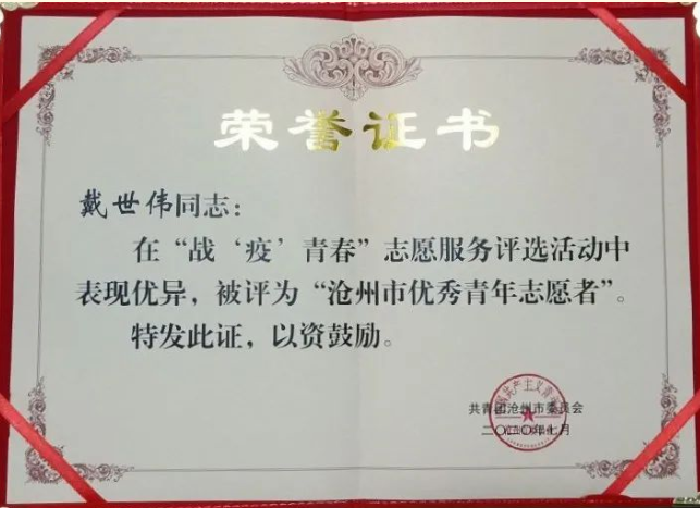 众志成城战疫情,志愿服务暖人心 我校土建学子戴世伟荣获“沧州市优秀青年志愿者”荣誉称号