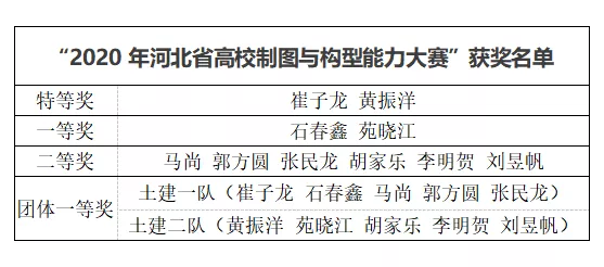 近日,由河北省教育厅主办,河北省工程图学学会承办的“2020年河北省高校制图与构型能力大赛”落下帷幕。在大赛中,我校土木建筑工程学院学子喜获佳绩,共获特等奖2名,一等奖2名,二等奖6名,团体一等奖2项。