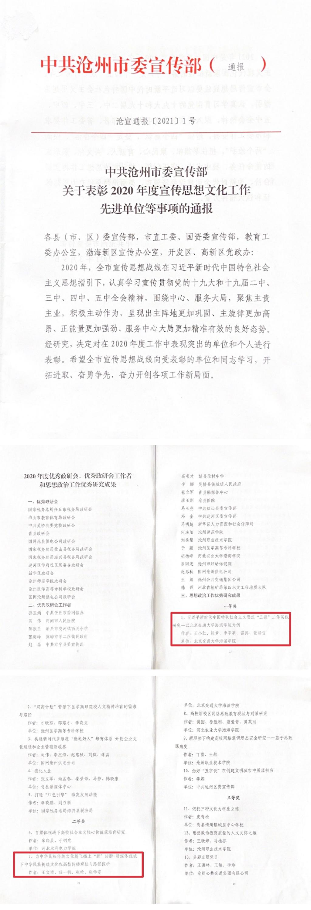 近日,中共沧州市委宣传部下发《关于表彰2020年度宣传思想文化工作先进单位等事项的通报》,公布沧州市2020年度思想政治工作研究成果评选结果,我校荣获一等奖和二等奖各一项。