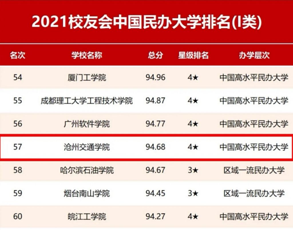 3月25日,全国第三方大学评价机构艾瑞深校友会网(cuaa.net)正式公布《2021校友会中国大学排名—高考志愿填报指南》,最新发布2021中国民办大学排名(含独立学院)榜单。榜单显示,我校在已完成转设为民办高校的背景下,跻身中国高水平民办大学行列。在中国民办大学(含独立学院)的大排名中,以94.68分位列《2021校友会中国民办大学排名(Ⅰ类)》第57名,并以四星级排名荣获中国高水平民办大学美誉。