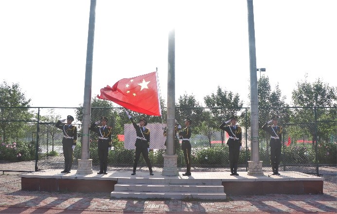 本次典礼在雄壮的国歌声中拉开帷幕,五星红旗冉冉升起,全场师生庄严肃立,行注目礼。