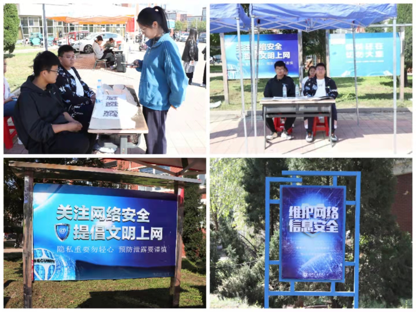 我校对该活动高度重视,各相关单位落实责任分工,采用线上、线下相结合的形式对网络安全宣传周进行了广泛宣传。校园内张贴了众多新颖的宣传展板及条幅,引得师生纷纷驻足观看。我校还在教工食堂、一期食堂、二期食堂门前广场搭建了帐篷,设置宣传点。师生可通过在宣传现场扫码,参与网络安全知识线上答题活动。活动现场人头攒动,在师生中引起极大反响。