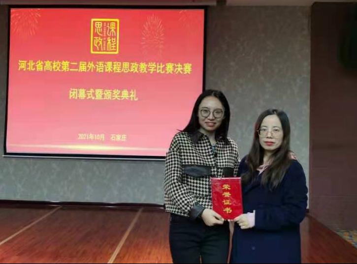 据了解,本次大赛由河北省高等学校外语教学指导委员会、河北省高等学校外语教学研究会高等教育出版社、河北师范大学承办,共有63个教学团队进入决赛,其中大学英语组29个。我校教师团队凭借扎实的知识功底,良好的逻辑思维能力、协调沟通能力以及抗压能力,经过比赛现场的激烈角逐,层层选拔,最终荣获大赛三等奖。