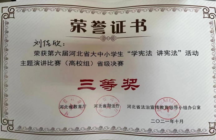 刘佳欣同学获得“学宪法 讲宪法”主题演讲比赛(高校组)省级决赛三等奖。