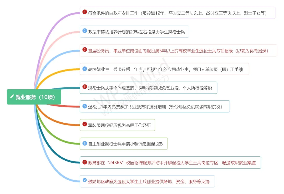 ①义务兵服现役经历视为基层工作经历或者计算为工龄;②每年在公务员、事业单位工作人员聘用考试中安排大学生退役士兵定向考录指标,比例不低于当年符合条件列入范围的大学生退役士兵总数的10%;③全省专武干部职务出现空缺时,主要从退役大学生士兵中招录;④全省政法干警招录时,安排20%用于定向招录退役大学生士兵;⑤国有企业招工时,安排不低于5%的比例,用于定向招录退役大学生士兵;⑥退役大学生士兵参加大学生村官、特岗教师、“三支一扶”志愿者招聘时,笔试成绩加5分,同等条件下优先聘用。大学生西部计划志愿者对列入范围的大学生退役士兵实际单独招录,比例为总名额的20%。⑦自主就业退役士兵从事个体经营的,3年内依次减免部分税费,限额标准每户每年12000元,最高上浮20%。企业招用自主就业退役士兵,3年内按照实际招用人数依次减免部分税费,定额标准每人每年6000元,最高上浮50%。