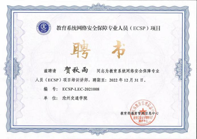 为贯彻落实《中华人民共和国网络安全法》和教育系统有关党委(党组)网络安全责任制考核要求,全面提升教育系统人员网络安全素养和岗位技能水平,教育部教育管理信息中心启动“教育系统网络安全保障专业人员(ECSP)”培训项目,我校网络信息技术中心副主任贺秋雨被聘为ECSP讲师。