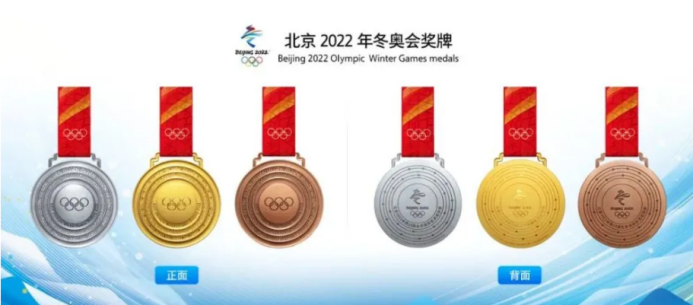 冬奥会奖牌背面中心刻有北京冬奥会会徽,周围刻有北京2022年冬奥会中文全称(北京2022年第24届冬季奥林匹克运动会)字样。圆环上刻有24个点及运动弧线,取意古代天文图,象征着浩瀚无垠的星空,人与自然的和谐,也象征着第24届冬奥会上运动员如群星璀璨,创造佳绩。奖牌背面最外环镌刻获奖运动员的比赛项目名称。