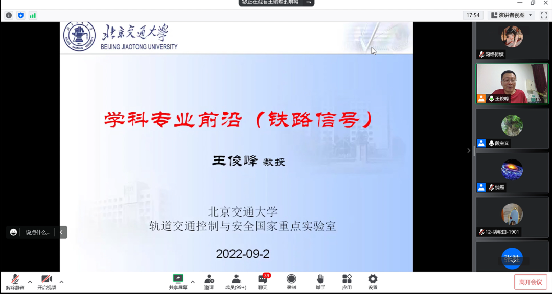 为增进同学们对专业发展方向和学科前沿领域的了解,使同学们扩宽工程视野、明确发展方向,我校特邀请北京交通大学轨道交通控制与安全国家重点实验室副主任王俊峰教授于99日晚1900在腾讯会议举行线上铁路信号学科专业前沿讲座。出席本次讲座的老师有:轨道交通学院院长钟雁教授、轨道交通信号与控制专业负责人段宝文老师。19级信号全体学生参加本次讲座