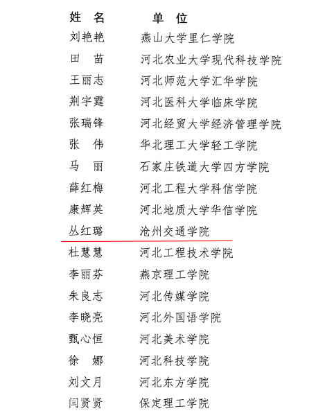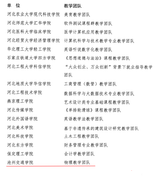 近日,河北省教育厅公布了2022年度河北省普通本科院校教学名师和优秀教学团队名单(冀教高函202257号),我校通识教育学院丛红璐副教授2022河北省普通本科院校教学名师称号,其带领物理教学团队”荣获2022河北省普通本科院校优秀教学团队