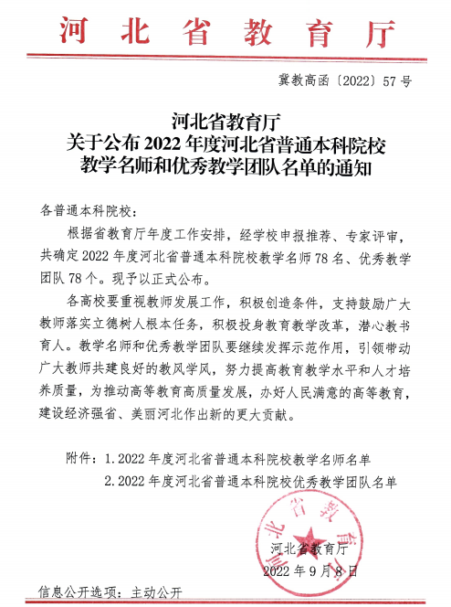 我校教师荣获2022年度河北省 普通本科院校教学名师和优秀教学团队荣誉称号