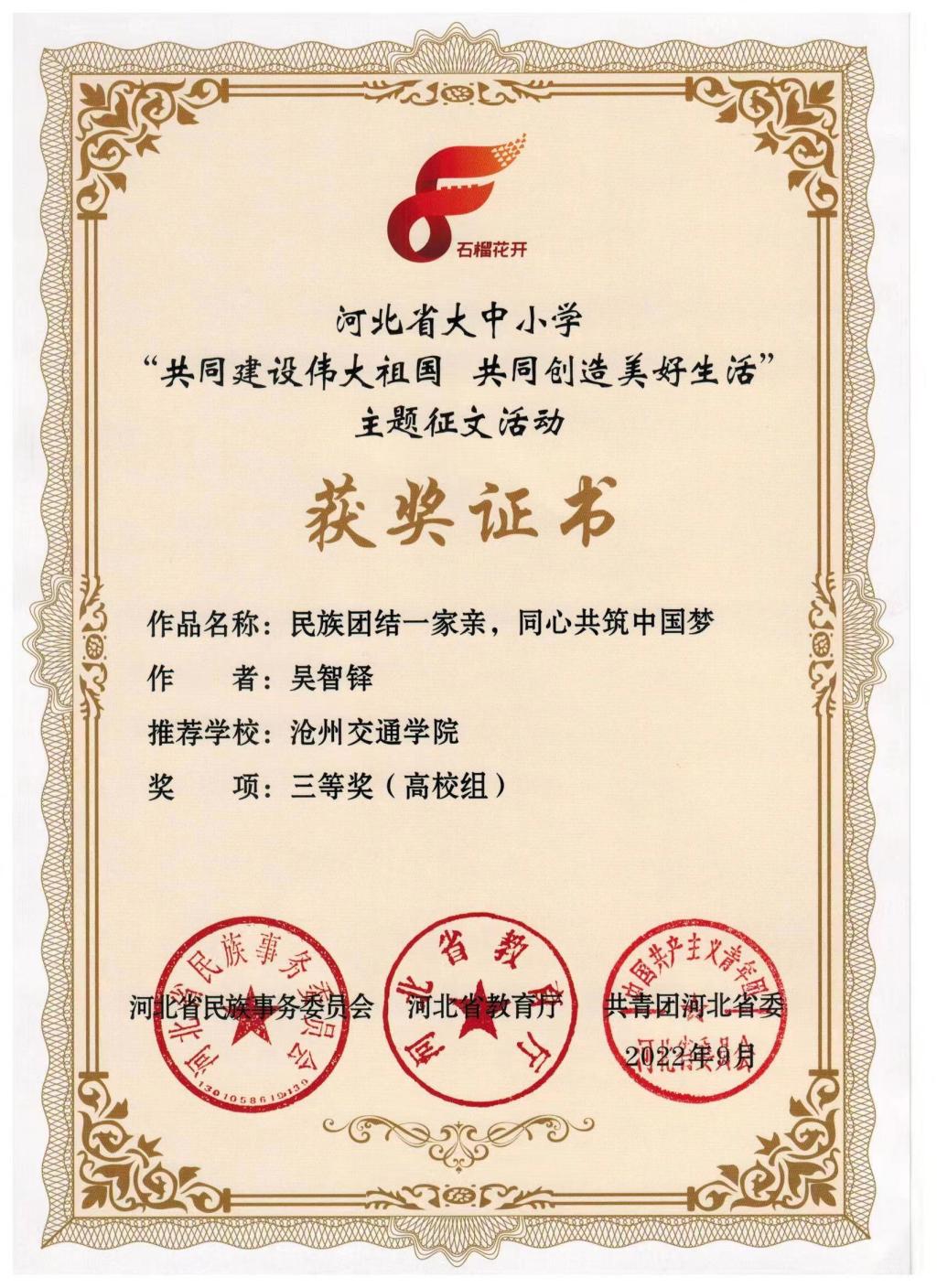 近日,在河北省民族事务委员会、河北省教育厅、共青团河北省委举办的“河北省大中小学‘共同建设伟大祖国 共同创造美好生活’主题征文活动”中,我校土木建筑工程学院学生吴智铎的作品《民族团结一家亲,同心共筑中国梦》荣获三等奖。