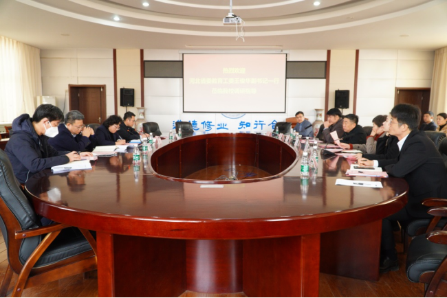 2月23日上午,河北省委教育工委副书记、省教育厅党组成员王俊华、省教育厅党建处处长宋吉国,沧州市委教育工委副书记代砚广、党建科科长蔡昶军一行莅临我校调研指导党建工作。渤海新区黄骅市副市长张桂云,祥兴集团副总裁薛君南,我校党委副书记、常务副校长张长铎,财务总监兼总会计师余裕玲,副校长赵金楼、邵晓康,副书记吴立军共同参加本次党建工作调研。