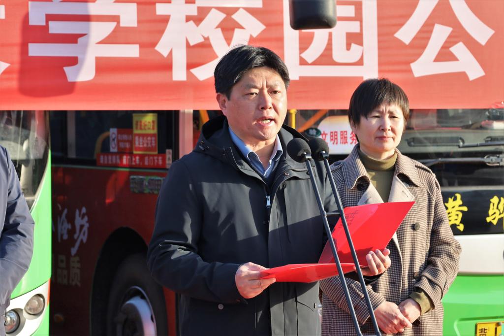 沧州渤海新区黄骅市副市长张桂云宣布沧州渤海新区黄骅市大学校园公交专线开通。