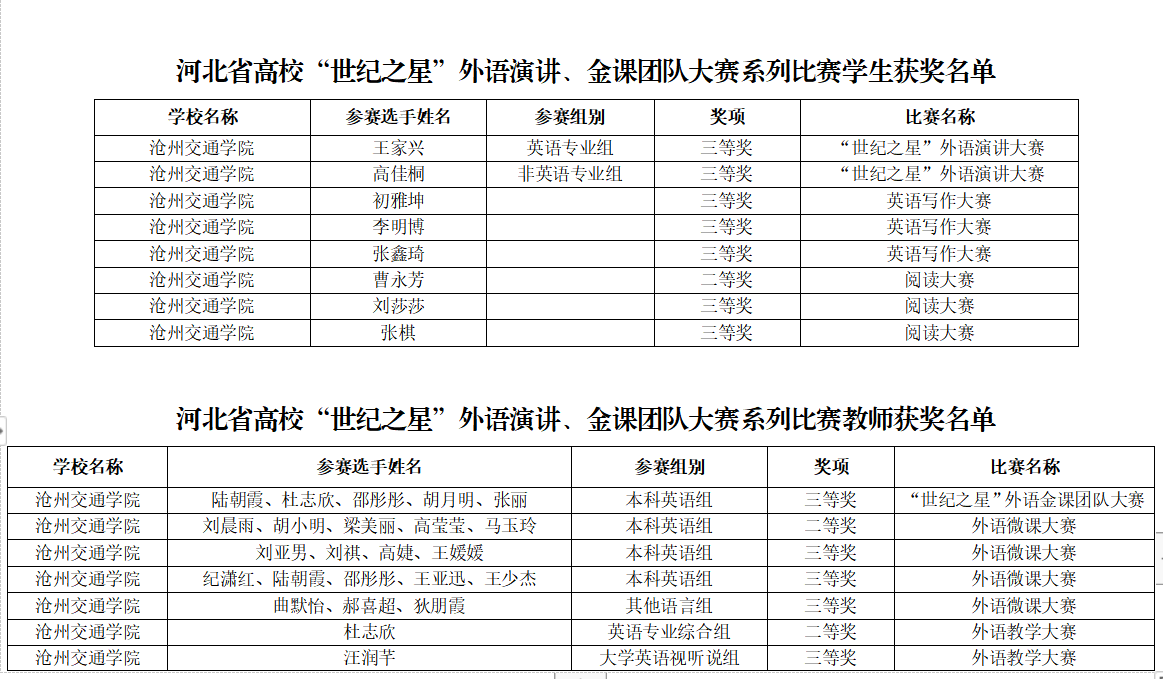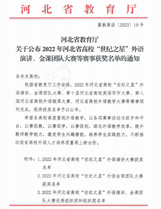 近日,河北省教育厅发布了《河北省教育厅关于公布2022年河北省高校“世纪之星”外语演讲、金课团队大赛等获奖名单的通知》(冀教高函〔2023〕19号),此系列比赛中,我校外国语学院多名师生共获奖15项。