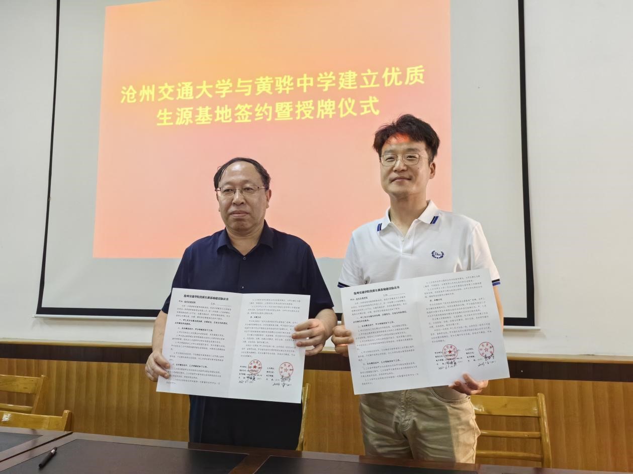 随后,我校副校长、党委副书记邵晓康与黄骅中学党委书记、校长李拥军签订《沧州交通学院优质生源基地建设协议书》,并授予黄骅中学“优质生源基地”牌匾。