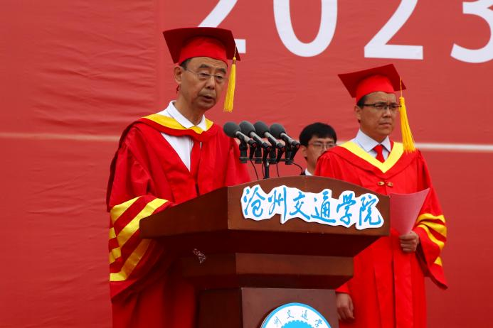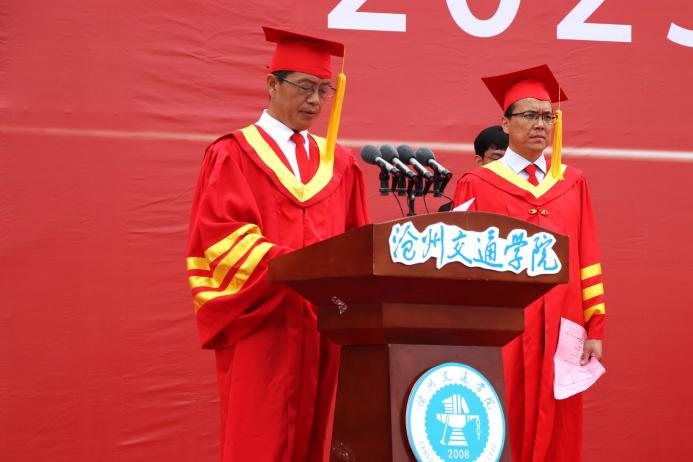 校长章梓茂首先代表学校感谢了以黄骅市委市政府为代表的各界政府领导,北京交通大学的各位领导、专家和教授以及主办方,他表示,三方精诚合作,历经十五年的风霜,共同建设发展成如今的沧交大家庭。在讲话中他指出,当今大学生身处新时代,要敢想敢为又善作善成。他对毕业生提出三点要求,第一,要勇担历史使命,力争成为中华民族伟大复兴的建设者、参与者、分享者、贡献者;第二,要有骨气、有志气,继承发扬“进德修业,知行合一”的校训精神,增知博见,凝心聚力,击楫前行;第三,要勤劳认真,团结友爱,勇立潮头,谱绘新篇。最后,章梓茂校长为毕业生代表拨苏正冠,启动学位授予仪式。
