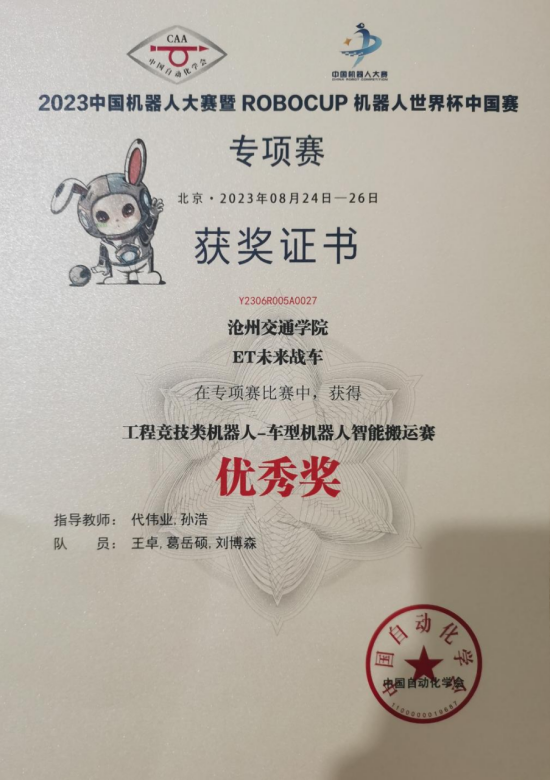 8月24日至26日在北京举行的中国机器人大赛暨RoboCup机器人世界杯中国赛专项赛中,我校机械与动力工程学院派出两支队伍参赛,分别是由赵鑫然、崔泽和王永三名同学组成的队伍以及王卓、葛岳硕和刘博森三名同学组成的队伍,指导老师代伟业和孙浩带领参赛。两支队伍分别荣获专项赛一等奖一项、优秀奖一项,其中获得专项赛一等奖的队伍被推荐至中国赛,于10月13日至15日在福建晋江参加中国赛荣获国家二等奖,实现了我校在该赛事上新的突破。