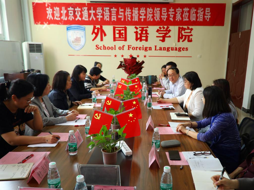 会议伊始,章梓茂校长对戴江雯主任一行的来访表示热烈欢迎,并对学校基本情况进行了介绍。戴江雯主任对我校的热情接待表示感谢,对北京交通大学语言与传播学院的师资情况、英语教学等进行了简要介绍,双方就教学、科研展开了交流。